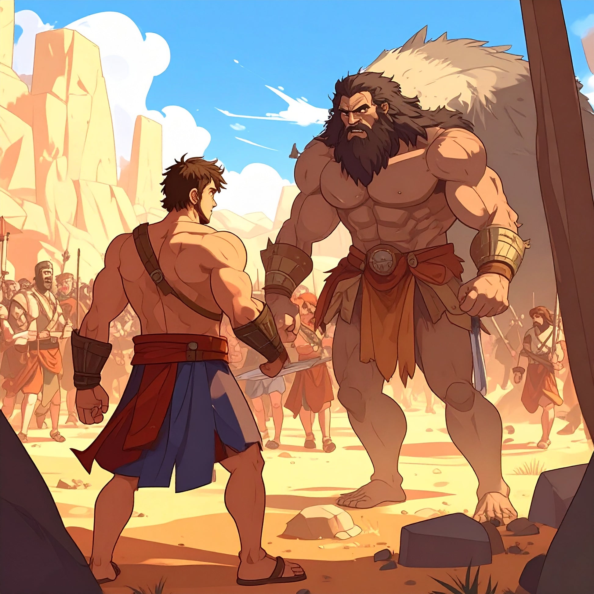 In De Vallei van Ela verzamelen de legers van Israël en de Filistijnen zich. Een dreigend gevoel van conflict hangt in de lucht terwijl de vijandige machten tegenover elkaar staan, wachtend op het moment dat de strijd zich ontvouwt.